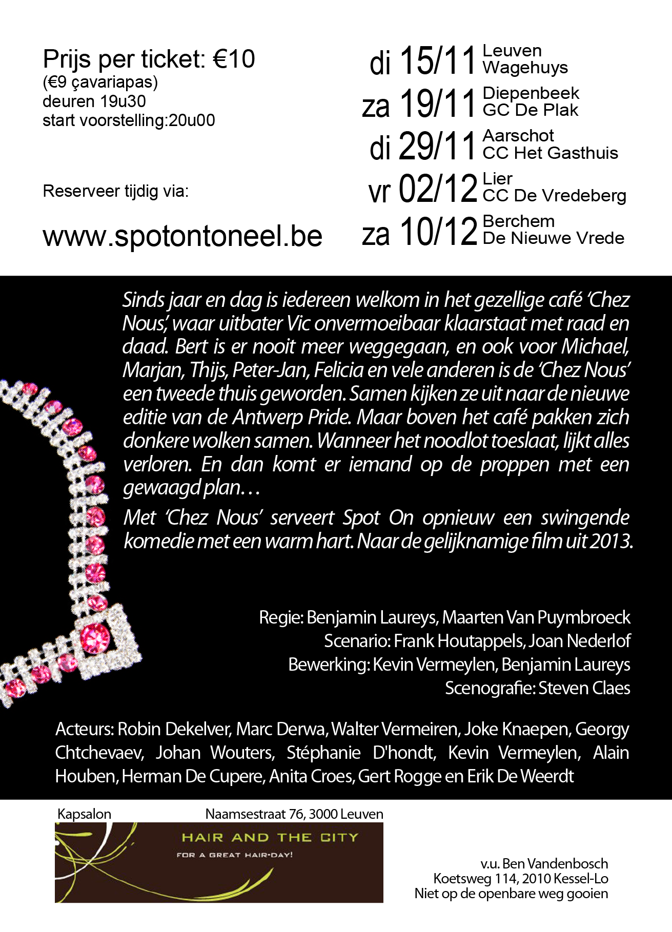 Sinds jaar en dag is iedereen welkom in het gezellige café 'Chez Nous', waar uitbater Vic onvermoeibaar klaarstaat met raad en daad. Bert is er nooit meer weggegaan, en ook voor Michael, Marjan, Thijs, Peter-Jan, Felicia en vele anderen is de 'Chez Nous' een tweede thuis geworden. Samen kijken ze uit naar de nieuwe editie van de Antwerp Pride. Maar boven het café pakken zich donkere wolken samen. Wanneer het noodlot toeslaat, lijkt alles verloren. En dan komt er iemand op de proppen met een gewaagd plan....